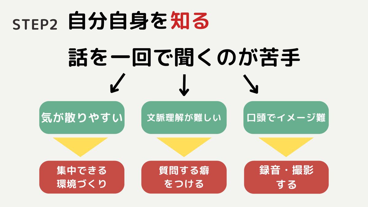 次に先生と一緒にコミュニケーションを取りながら、得意・苦手を把握していき、特に苦手なことを分析していきます。さらにそのいろいろな原因に対して、一つひとつどのような対策を行わなければいけないのかを言語化していきます。