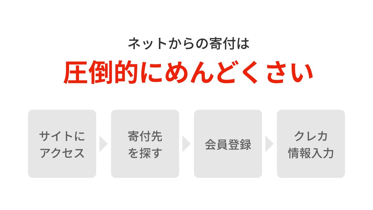 確かに、ネットからの寄付は圧倒的にめんどくさいんですよ。会員登録をしたり、クレジットカード情報の入力をしたりする。これは非常にやる気がある人じゃないと寄付ができません。