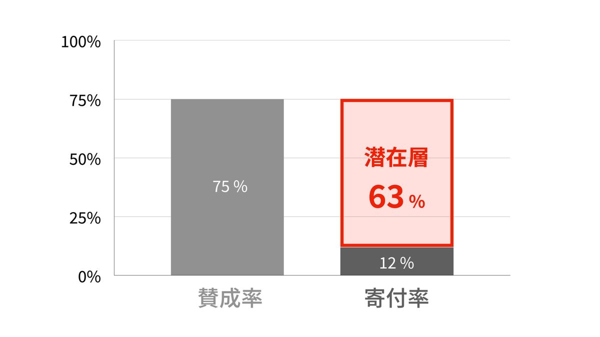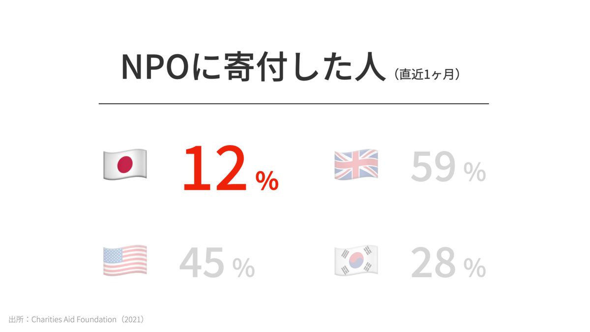 みなさん、寄付と聞いてどんなことを思いますか? 寄付はしたほうがいいと思っている日本人は、実に75パーセントいると言われています。一方で、寄付をしている人は12パーセントに留まっています。世界的に見ても、非常に寄付する人が少ない。これが日本の寄付の現状です。