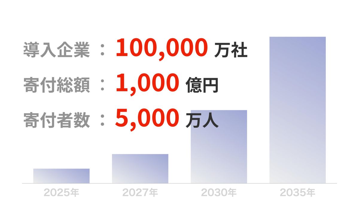 まず導入企業50社を今年度中に達成します。2027年には10億円の寄付、100万人の寄付者数を実現します。2030年、寄付者数は1,000万人を突破し、10年後の2035年には1,000億円の寄付、そして寄付者数は5,000万人、ここを目指していきます。