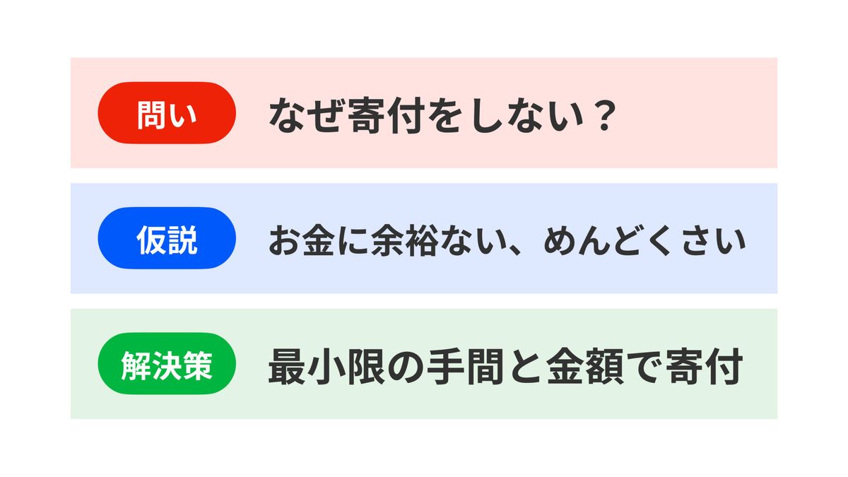 まとめると、なぜ63パーセントもの潜在的寄付者は寄付をしないのか。理由としては、1,000円からしか寄付ができない上に、寄付の方法が非常に面倒くさい。その結果、寄付をするハードルが圧倒的に高いんです。