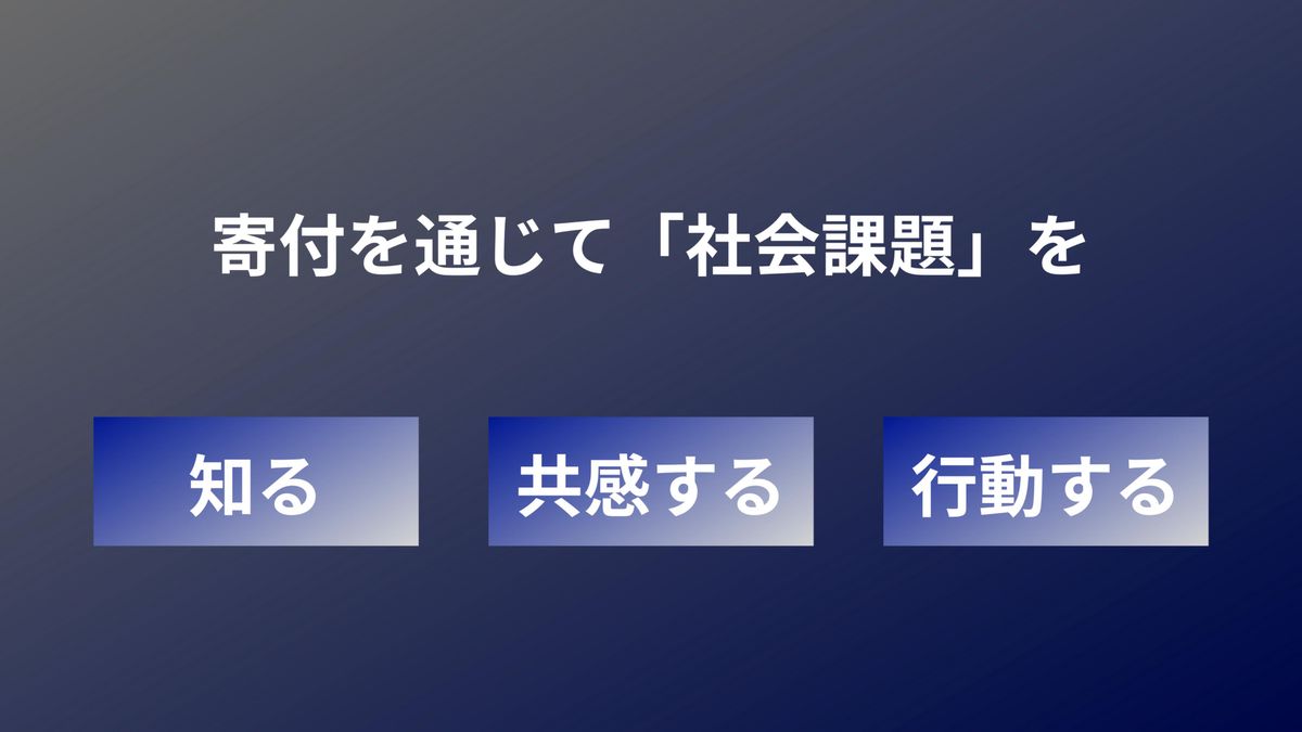寄付を通じて社会課題を知る、共感する、行動を起こす。つまり寄付をすることは、社会課題の解決に参画することです。みなさん、最後にお願いがあります。今日はたくさんの社会課題に触れたと思います。ぜひアクションに移していただきたい。まずは小さくてもいいから寄付から始めてみませんか?