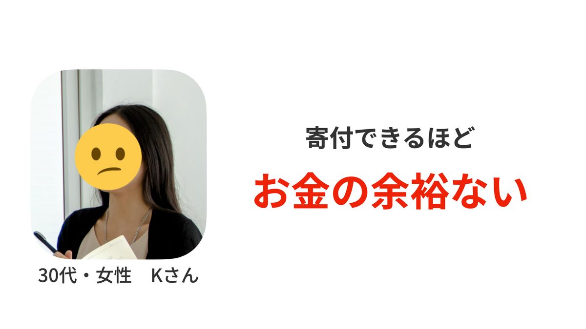 Kさん。「寄付できるほどお金の余裕がない」。これは最も多かった声です。確かにネットからの寄付は1,000円からしかできないことも多く、寄付をしてみるハードルが高いです。次に多かった声、Hさん。「社会にいいことはしたいけど、正直めんどくさい」。わかりますよね。