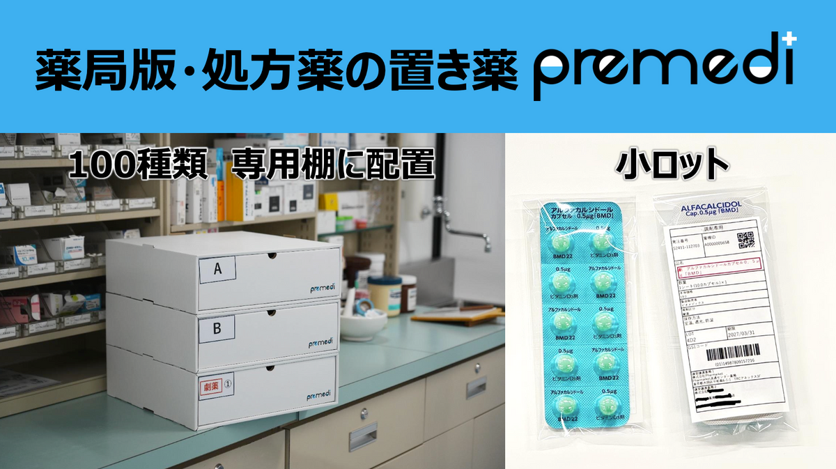 なので私たちは、薬局に置き薬を置くことにしました。卸からは箱でしか買えないような医薬品に独自の梱包を施し、10錠、20錠といった小ロットで買えるようにします。そしてそれを専用棚に配置し、使わなかったら返せるような、リスクのない置き薬として提供するんです。