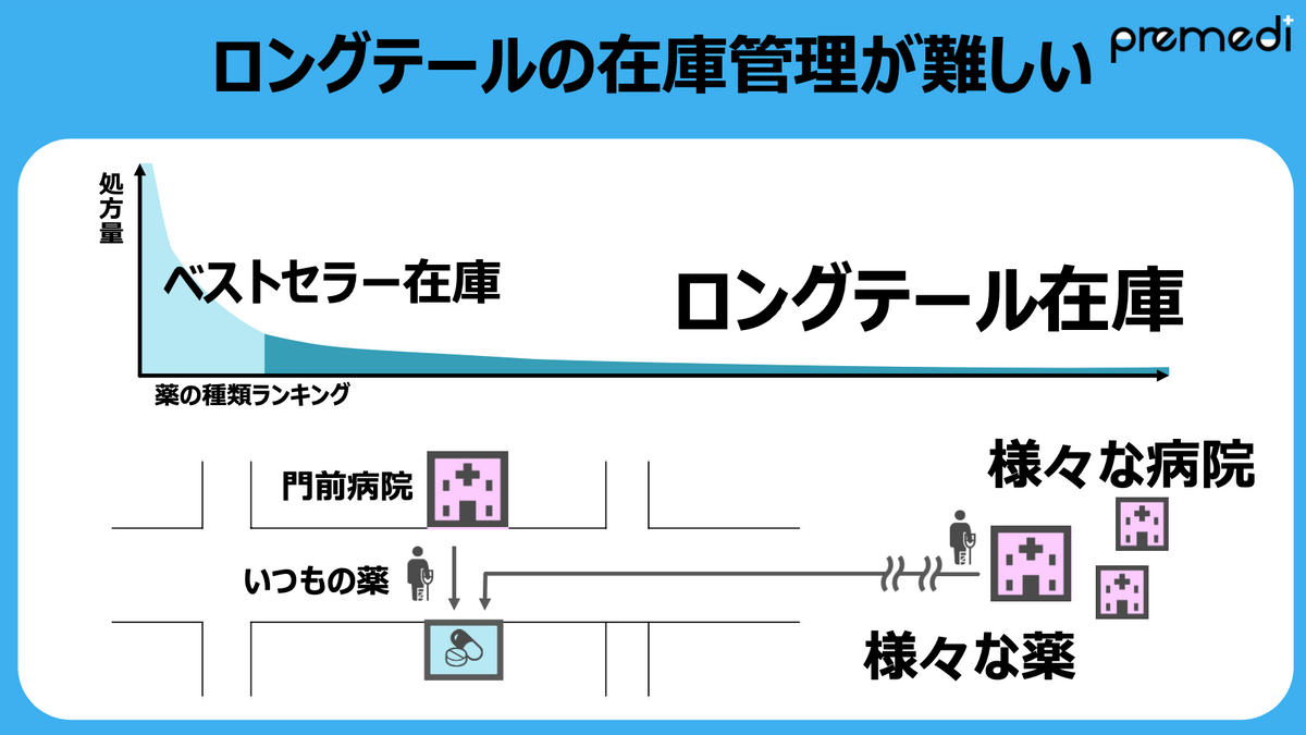 薬局の在庫管理って難しすぎるんですよ。そもそも薬品は2万種類あります。それを処方箋どおりに出さなきゃいけません。そして、さらに細かく見ていくと、医薬品ってベストセラーとロングテールの2つに分けられます。