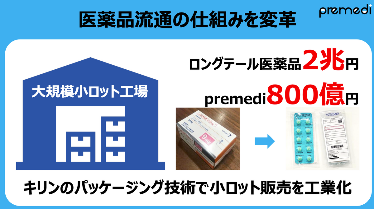 ロングテール医薬品は2兆円の流通市場になっています。それをキリンのパッケージング技術で小ロットで販売するというのを工業化して当たり前にし、800億円の事業にします。