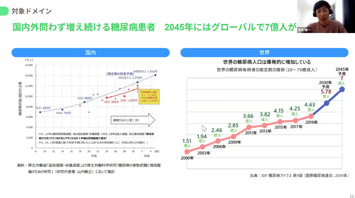 「じゃあ、どんな方の足を守るのか?」なんですけども、糖尿病の方々の足です。(スライドを示して)今、みなさまにご覧いただいているのは、左が国内、右が世界の糖尿病患者数の時系列での推移と予測です。