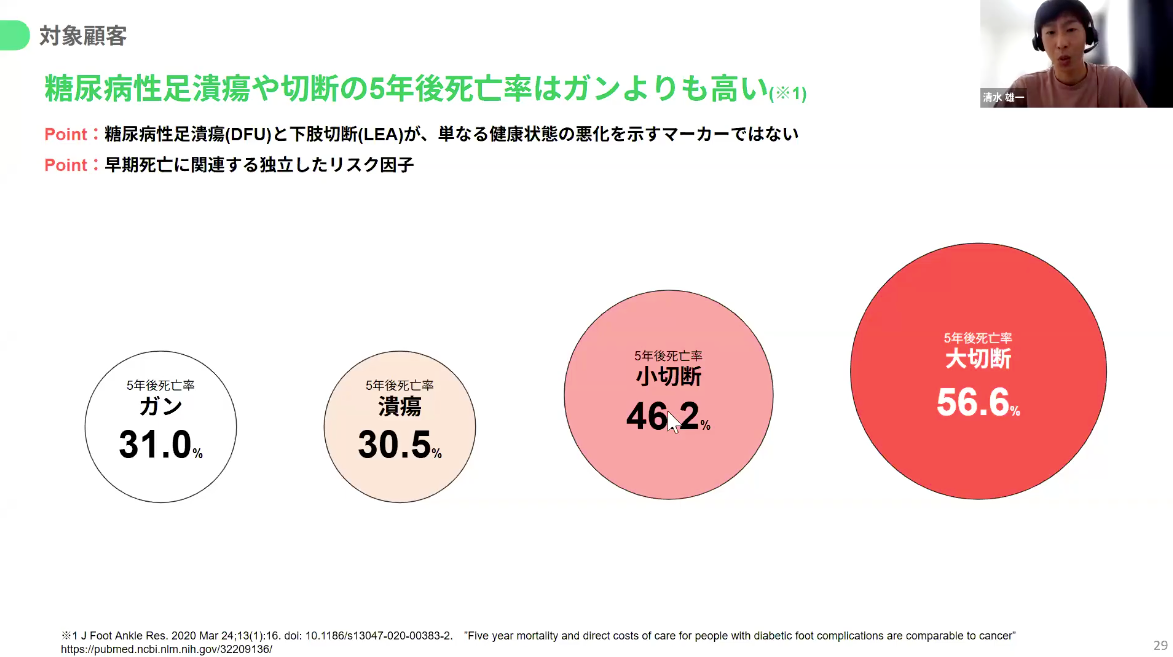 足(脚)を切って終わりではありません。実はこの潰瘍発生後の5年後の死亡率は、がんと並ぶような状況です。我々はがんと聞いたら少なからず命に危機を感じると思うんですけど、それに近い死亡率を持っているような症状だということです。