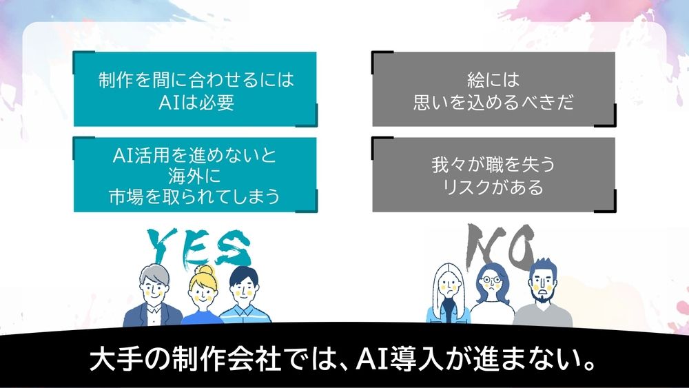 我々は、次世代の東映アニメーションを創ることをコンセプトに掲げて、2つのテーマに取り組んできました。1つ目が、AIの補助的な活用です。今、アニメ制作業界の中でも、AI活用は賛成派と慎重派に分かれています。大手のアニメ制作会社では、PoCはできるが、現場実装ができない。技術と現場の壁が厚く、身動きが取りにくい状況になっています。