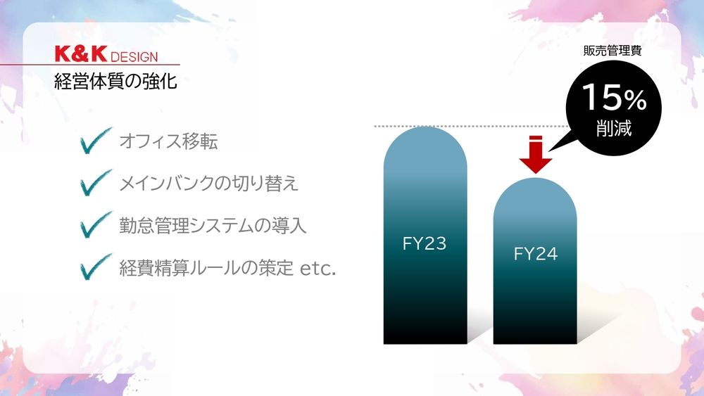 続いて、企業経営のアップデートです。前述のとおり、クリエイター社長の企業経営には限界があります。当社はM&A先のK&Kデザインにおいて、一つひとつ地道に、徹底的に見直しをかけてきました。正直、突飛なことは1つもしていません。それでも販管費は15パーセント削減され、利益の拡大に大きく寄与しています。