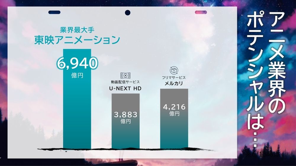 そんな業界ですが、ポテンシャルは非常に大きいです。業界最大手の東映アニメーションは、時価総額7,000億円に上ります。これはメルカリやU-NEXTの1.5倍以上の規模です。