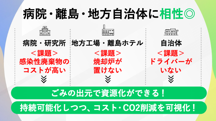すでに、産廃処理コストが非常に高い病院や、地方・離島の焼却炉から遠い工場・ホテル。それからドライバーがいなくて本当に困っていますという自治体さんから多くのお声をいただいています。