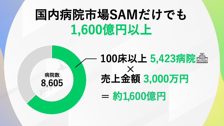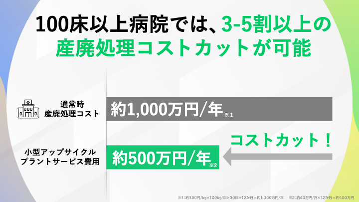 例えば100床以上の病院だと、年間1,000万円以上産廃処理コストがかかっているところがほとんどですが、我々のプラントサービスは、3割から5割以上、従来の処理コストも安く使っていただくことが可能です。病院だけでも1,600億円以上のマーケットがあります。