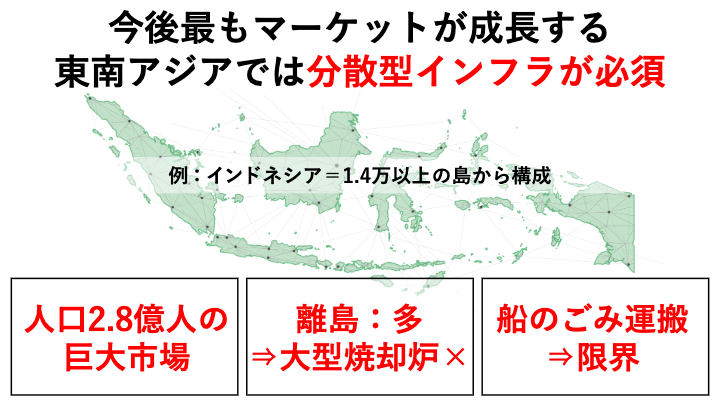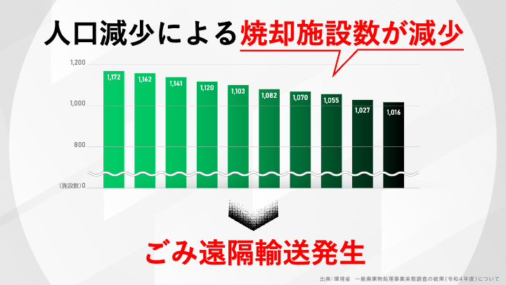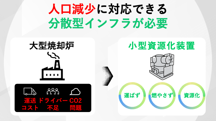 我々がこのインフラを開発している背景として、人口がどんどん減っているというところがあります。どんどん人口が減る中でごみの焼却炉の数は減っていて、遠くの焼却炉まで運べないと燃やせないという状況が発生しています。