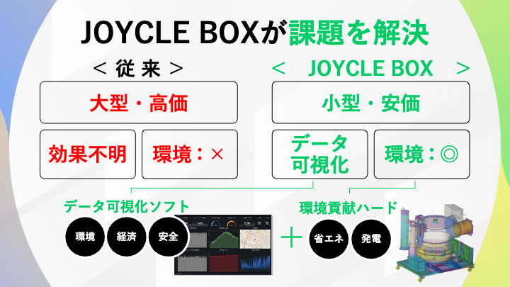 そこで提供するのがJOYCLE BOXです。小型で、車で運ぶことができて、環境、経済、安全のデータはすべて「JOYCLE BOARD」で可視化できます。
