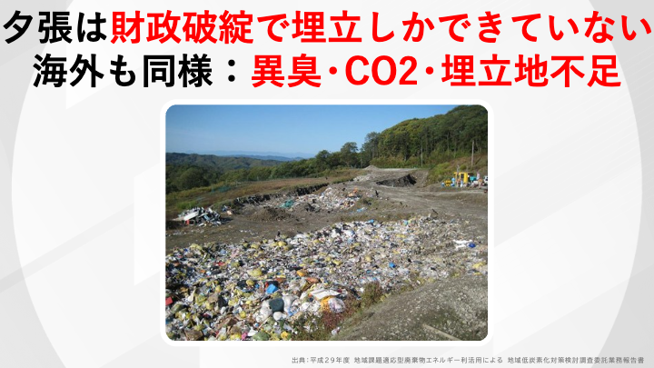 実際、運べず、燃やせずということで、財政破綻した夕張市では全部ごみを埋めちゃっています。この埋め立てごみが、深刻な問題になっているのは海外も同様というのは、みなさんもご存じのとおりかなと思います。