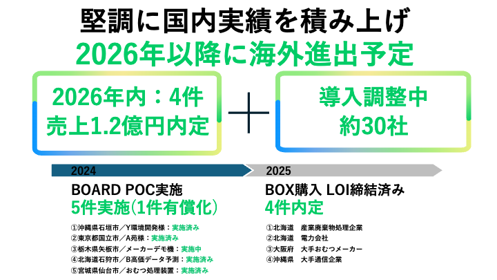 すでに3,000万円の装置4基分の売上が内定しており、1.2億円分の売上が内定しています。2026年から海外に展開していきます。すでにタイ、フィリピン、インドネシアから引き合いをいただいている状況です。
