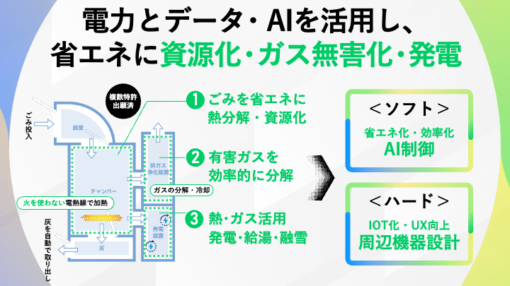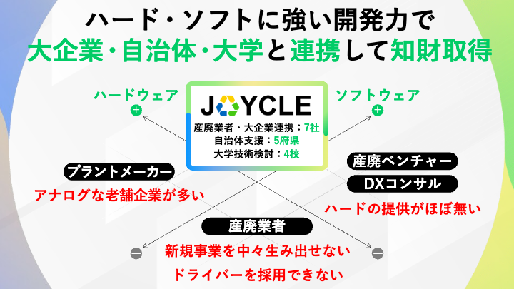ハードとソフトを設計できるエンジニアがそろっているだけではなく、産廃業者、大企業、自治体、大学と連携しながら、UXを高めるハードウェアと省エネをより促進するソフトウェアの両方の知財を取っていっているというところが、我々の特徴です。