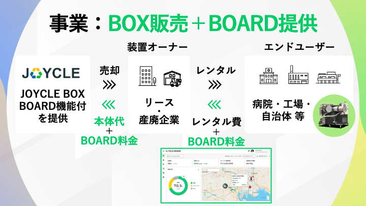 商流としては、オーナーさんに装置を販売して、我々のJOYCLE BOARDの月額制のサービスとセットでレンタルしてエンドユーザーさんに提供していくモデルになっています。