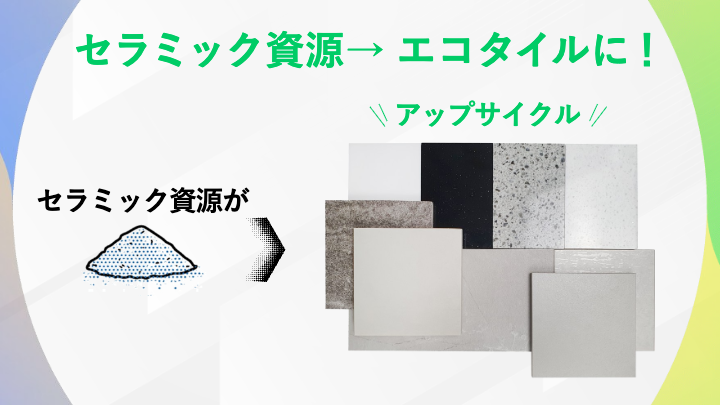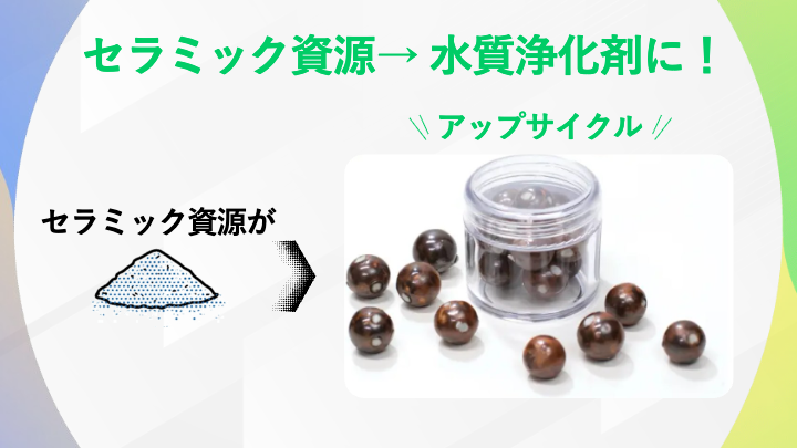 出てきた資源は、(スライドを示して)こういったエコタイルの建材にアップサイクルできたり、水をきれいにするセラミックボールにできたり、アートにすることが可能です。