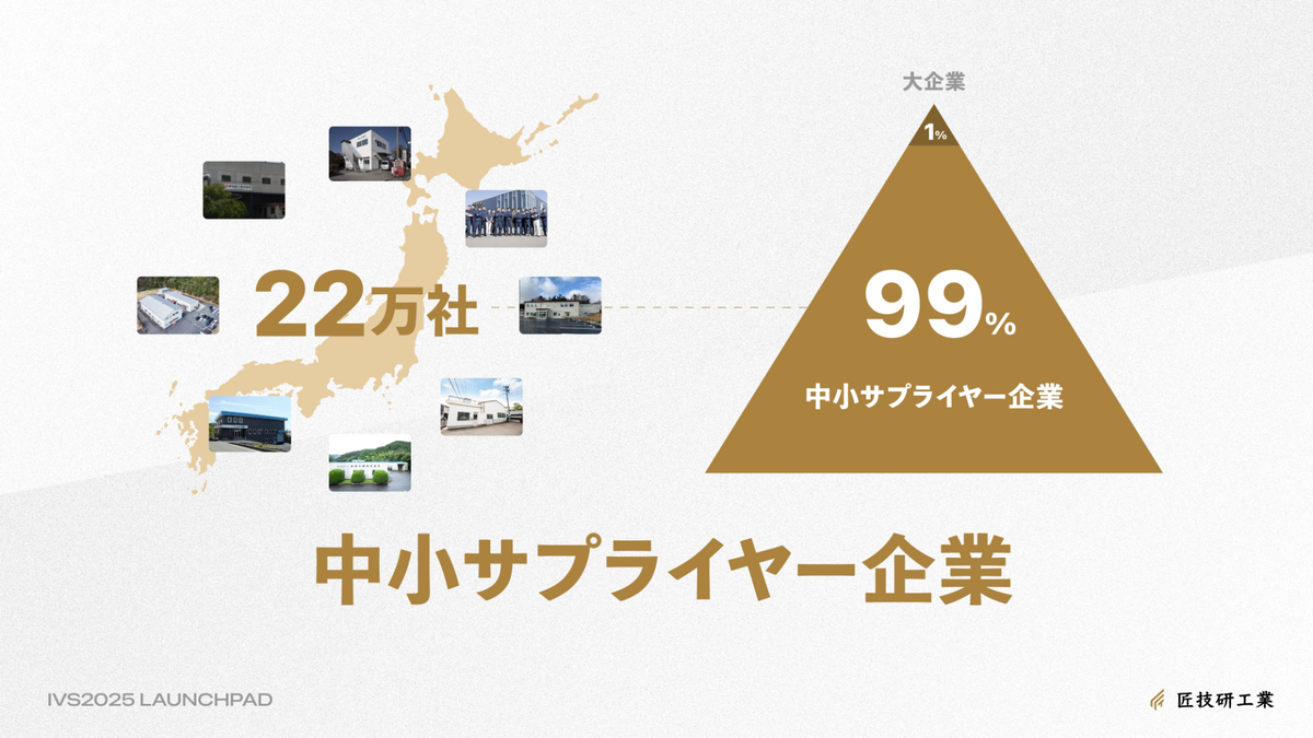 GDP比率20パーセントを誇る、日本の基幹産業である製造業。そんなモノづくり産業を根底から支えているのは、国内22万社、割合にして99パーセントを占める中小サプライヤー企業です。私たち匠技研工業は、この中小サプライヤー企業を起点に、製造業の変革に挑戦しています!
