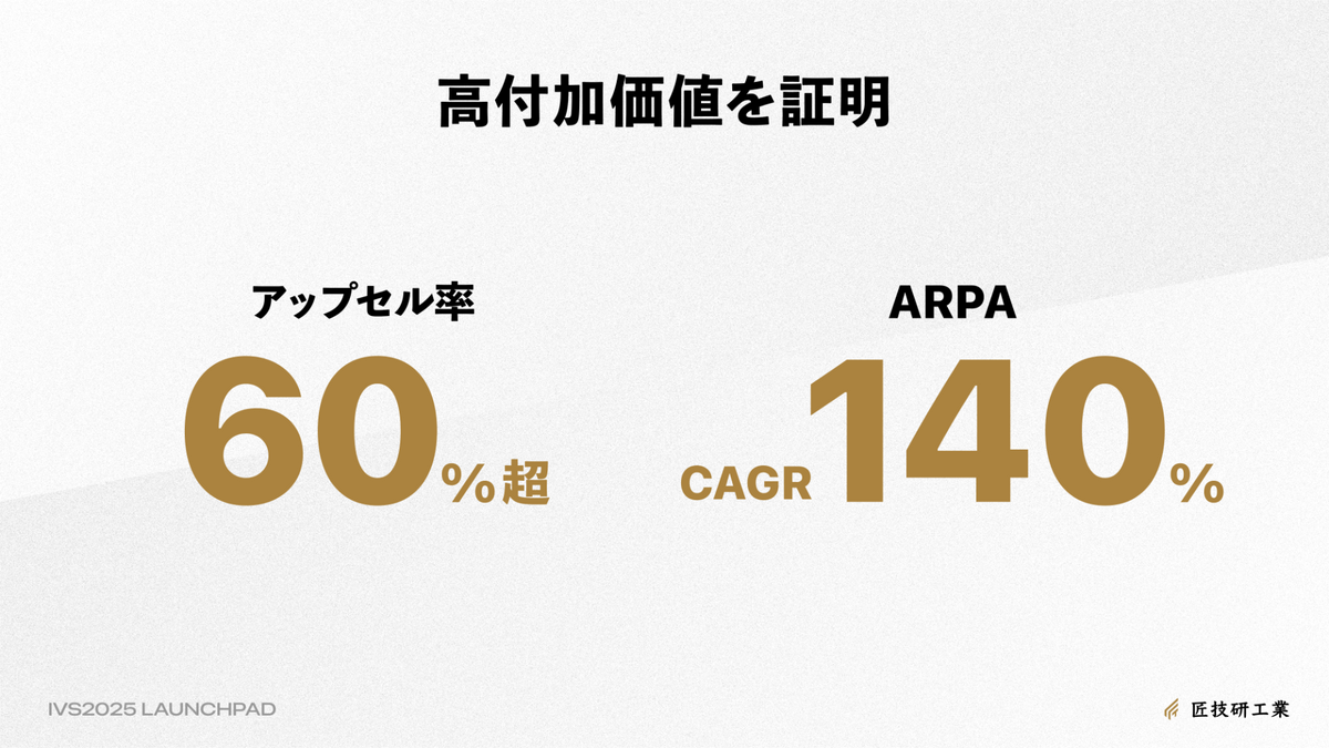 導入した顧客企業の満足度も高く、契約更新時のアップセル率は脅威の60パーセント超えです。ARPA(1アカウントあたりの平均売上)はCAGR(年平均成長率)140パーセントで推移しており、今後もさらに2倍以上に拡大する見込みです。