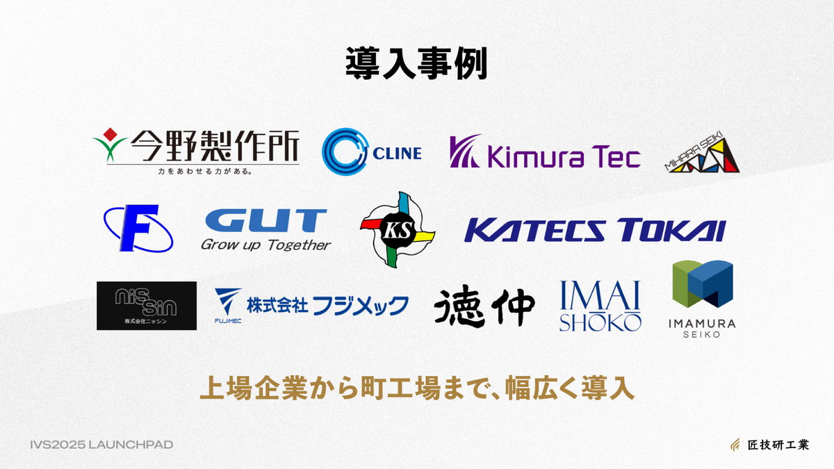 現在、上場企業から町工場まで、幅広い業種・業態にご利用いただいています。また、日本を代表するトップ企業、町工場の星と言われるような企業にも続々と導入いただいています。