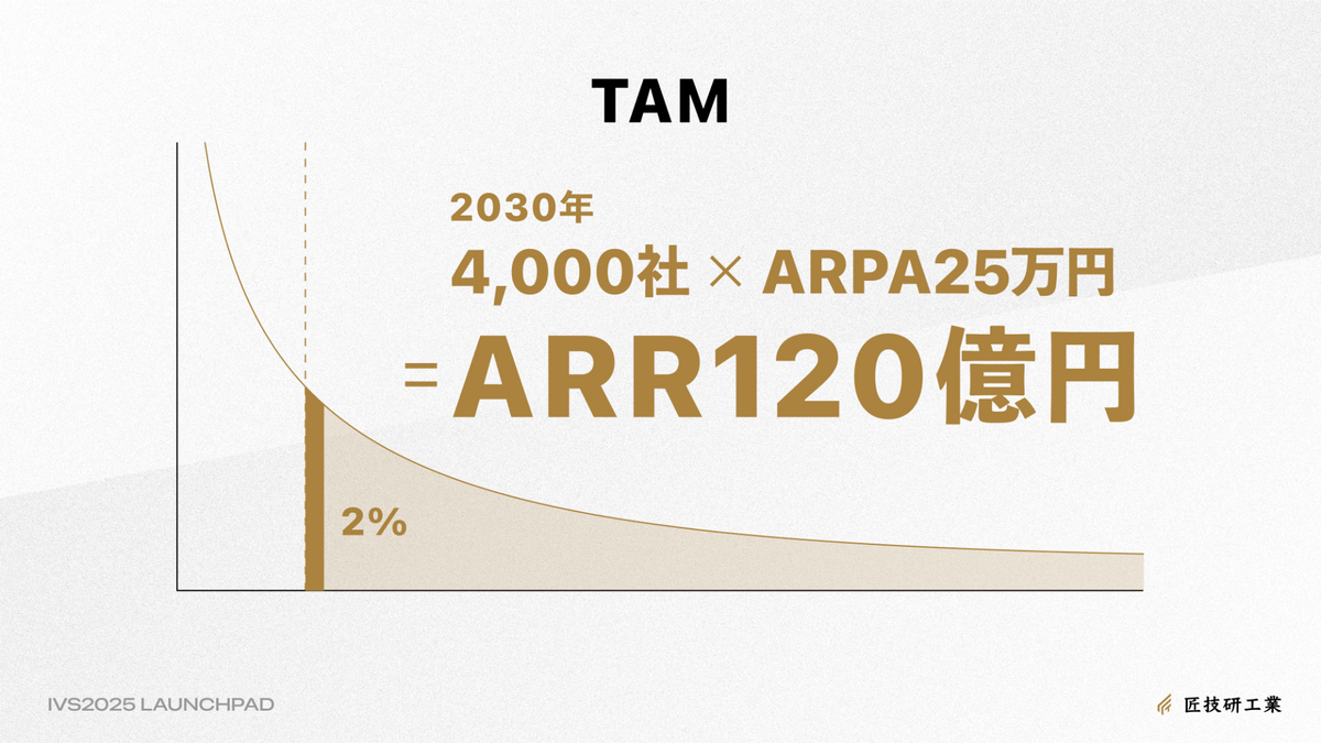 私たちが対峙しているのは、中小製造業22万社が存在するロングテールのマーケットです。2030年にはそのうち4,000社のたった2パーセントを獲得するだけで、ARR(年間経常収益)120億円を見込んでいます。