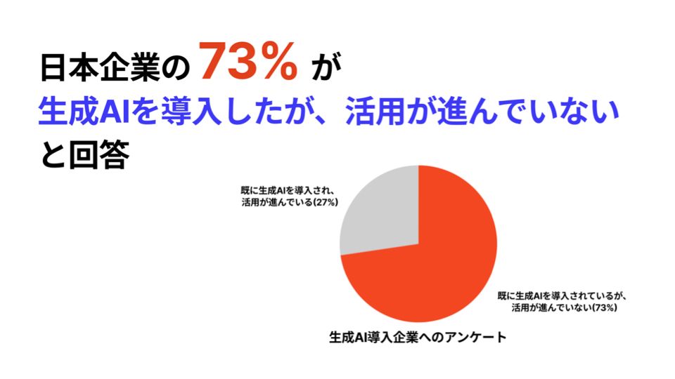 「Taskhub」は、生成AIのアプリケーションプラットフォームです。みなさんはChatGPT、生成AI、ふだんどれだけ活用していますか。実は日本企業の7割以上が生成AIを導入してるんだけど、ぶっちゃけ活用が進んでいないといわれています。