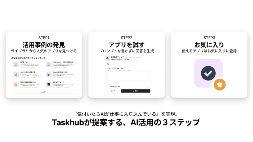 そうです、私たちは新たな生成AIの活用、3ステップをご提案します。まずライブラリから人気アプリを見つける。そしてフォームを入力してアプリを試す。最後に気に入ったらアプリ登録。そうすることによって、気づいたらみなさんの仕事にAIが浸透している。こんな仕組みを作りました。