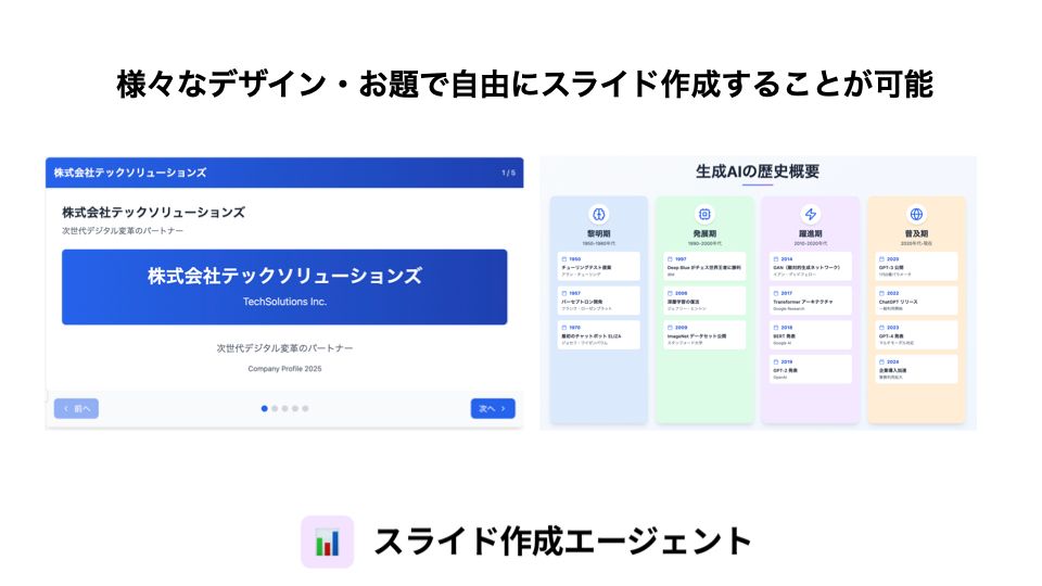 このスライドエージェントはさまざまなデザイン、お題で自由にスライドを作ることができます。スライド作成って面倒くさいですよね。これでスライド作成は省けました。