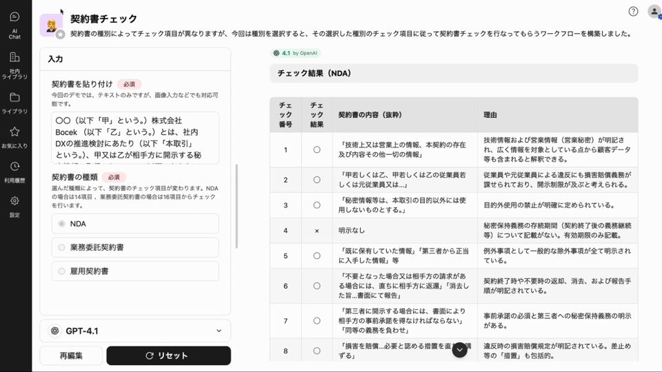 実行すると、弊社の法務部門が作った12個のチェックのマル・バツを全部作ってくれます。そしてマル・バツだけじゃなくて、修正したあとの契約書の条文も全自動生成です。これをやることによって、法務チェックの作業が全部省けました。