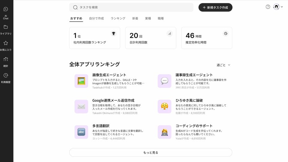実際に「Taskhub」のUIを見てみましょう。ログインすると、このようにライブラリと呼ばれるアプリの一覧が表示されます。こちらでは、「Taskhub」全体のアプリランキングが表示されます。それだけではなく、あなたの会社のアプリランキングを出すことができます。さまざまなアプリが並んでいます。