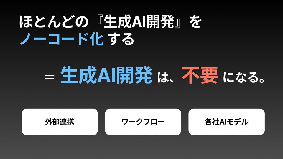 「Taskhub」が見せる未来の姿がこちらです。生成AI業界に2つの革命をもたらします。ほとんどの生成AI開発をノーコード化します。つまりAI開発は不要になります。現在はさまざまなツールが乱立していますが、「Taskhub」は1つに統合します。そして教育をしなくても、自律的にAI活用が広まる。つまりコンサルは要らなくなるんです。