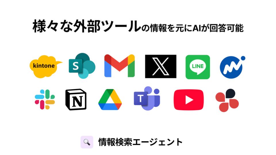 検索、ダルいですよね。今回はGoogleカレンダーとGoogleですが、実はさまざまな外部ツールと連携することが可能です。今回はこのスライド、情報検索、2つのエージェントを紹介しましたが、実は私たちはこの2つのエージェントを作っていなくて、アプリを作る仕組みそのものを作りました。私たちはそのツールを「Taskhub」と名づけました。