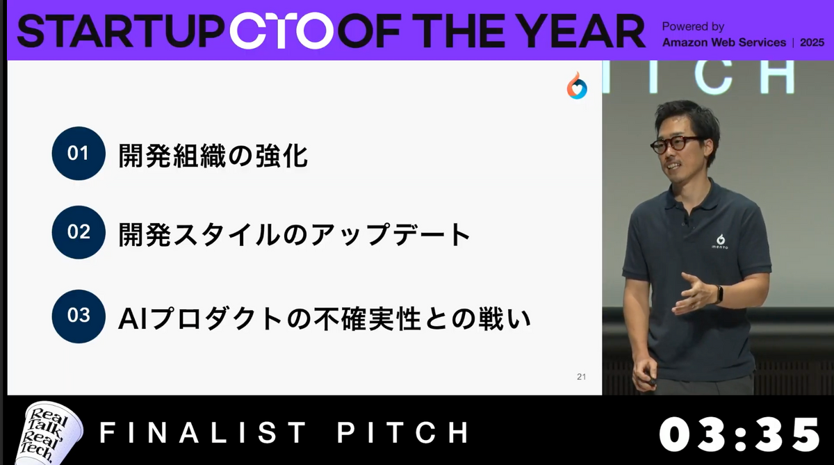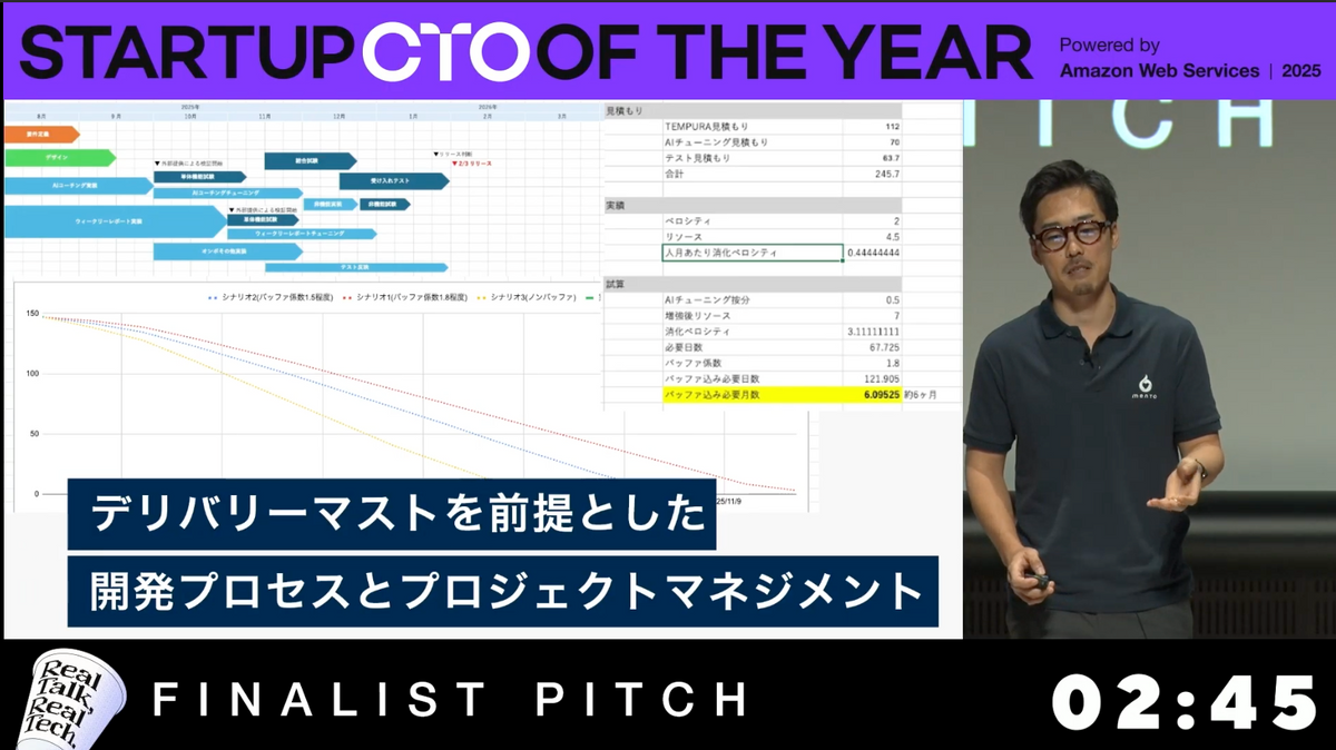 ・強いエンジニア採用と開発プロセスの刷新、AI×人×プロダクトの三位一体設計によって「マネジメントAI」を立ち上げ、10兆円企業での検証まで一気に進めたプロセスを紹介しています。