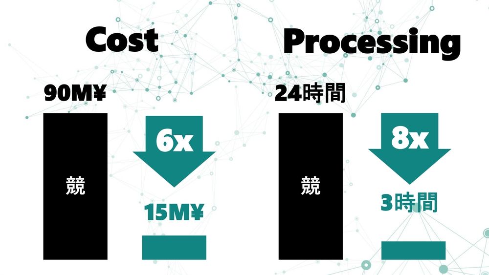 一般に使っているシステムは1億円に近いです。我々のソリューションは6倍コストを削減できます。同じく処理時間も、例えば3時間走ったら今は24時間だけど、我々のソフトは8倍速くなっています。