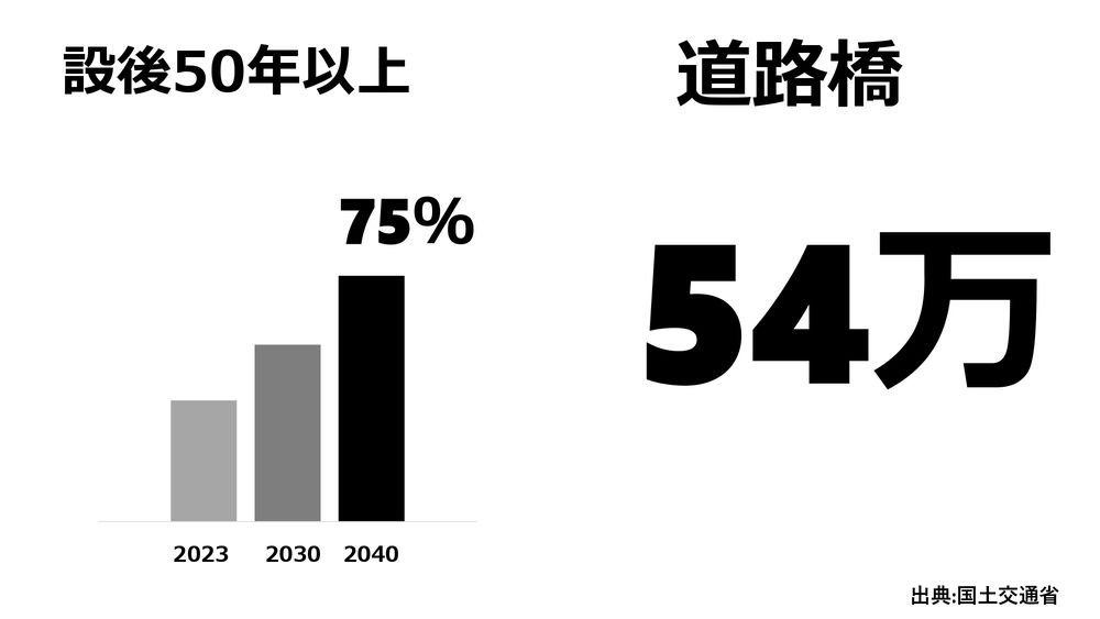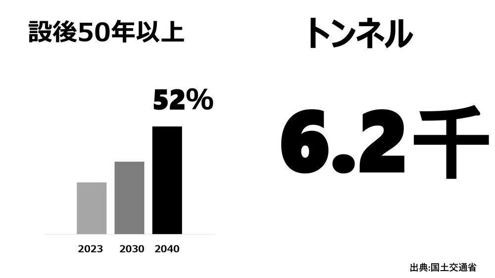 例えばメンテナンスについて話しましょうか。日本のインフラの橋だけで、2040年には、およそ54万ヶ所の設備が古くなってしまうんですね。これらは50年以上経っているんです。同じくトンネルは、国交省によると、2040年は6,200ヶ所になります。