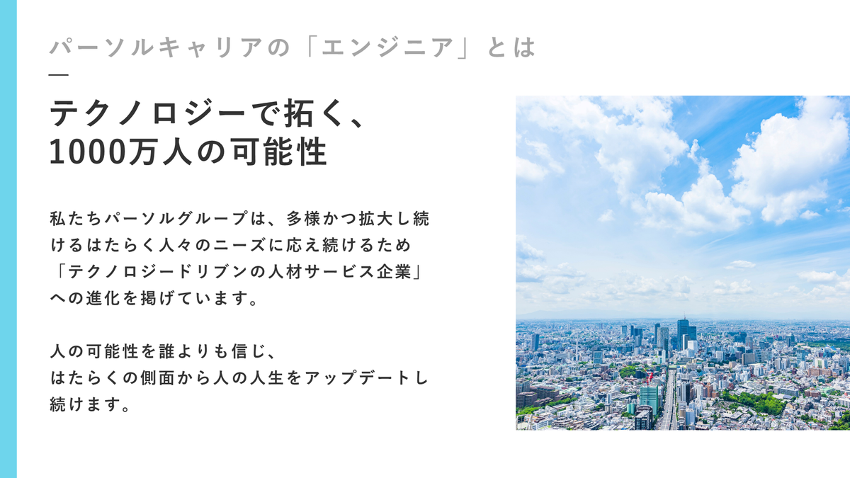 そういった変化とか、在宅ワークとかもコロナであったと思うんですけれども、そういった複業、フリーランスで働き方も全部多様性に合ったワークスタイル自体を、もうエンジニアとして価値発揮してもらえるような場所の提供を、パーソルキャリアは全部やっています。