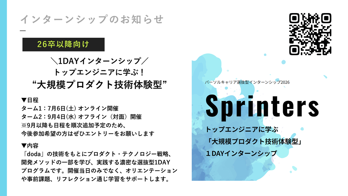 ちょっといきなり宣伝っぽくなっちゃうんですけども、インターンシップの発表をさせてください。1DAYでインターンシップをトップエンジニアの方たちとできるサービスをやっています。これは毎年やっていたんですけども、今年は1DAYで、ターム1が7月、ターム2は9月。なので、積極的に、今ぜひ我こそはってとこも含めてやってください。かなり好評です。