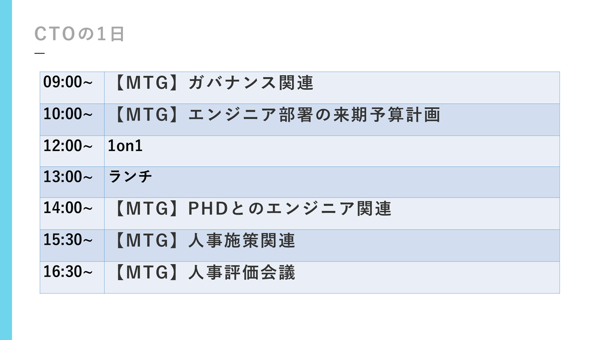 次ですね。じゃあCTOって何するの? みたいな。1日の(動きの一部を)本当に抜粋しただけなので、これだけじゃないんですけども。僕の場合は、本当にだいたい8時半とか9時ぐらいから、ミーティングとかが始まっています。リモートもあるんで、ほぼミーティングで、メチャクチャ多いんですけど。