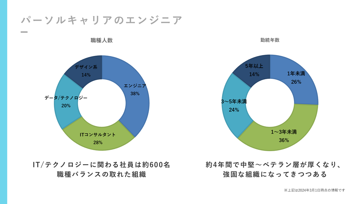 次に、パーソルキャリアのエンジニアなのですけども、外から見るとdoda(デューダ)の会社みたいに見えていると思うんですけども、実際サービスはそうなのですけども、裏ではだいたい今600人くらいエンジニアがいます。もうほぼ中小企業のまるまる1個の会社ぐらいですね。総合人材テックカンパニーになっています。