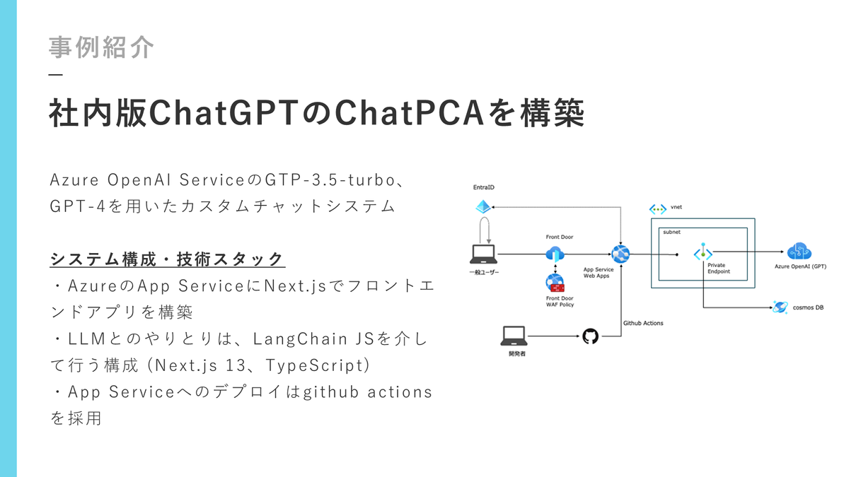 やはりテクノロジードリブンを掲げている以上は、こういったものを積極的に活用しようということで、弊社6,000人か7,000人の会社なのですけども、その企業にしてはかなり早いペースで社内のDX化を推進している上で、ChatGPTをカスタマイズしてChatPCAを作っています。Azure OpenAI ServiceのGPT-3.5 turboとか、GPT 4をカスタムチャットシステムというかたちで作っています。