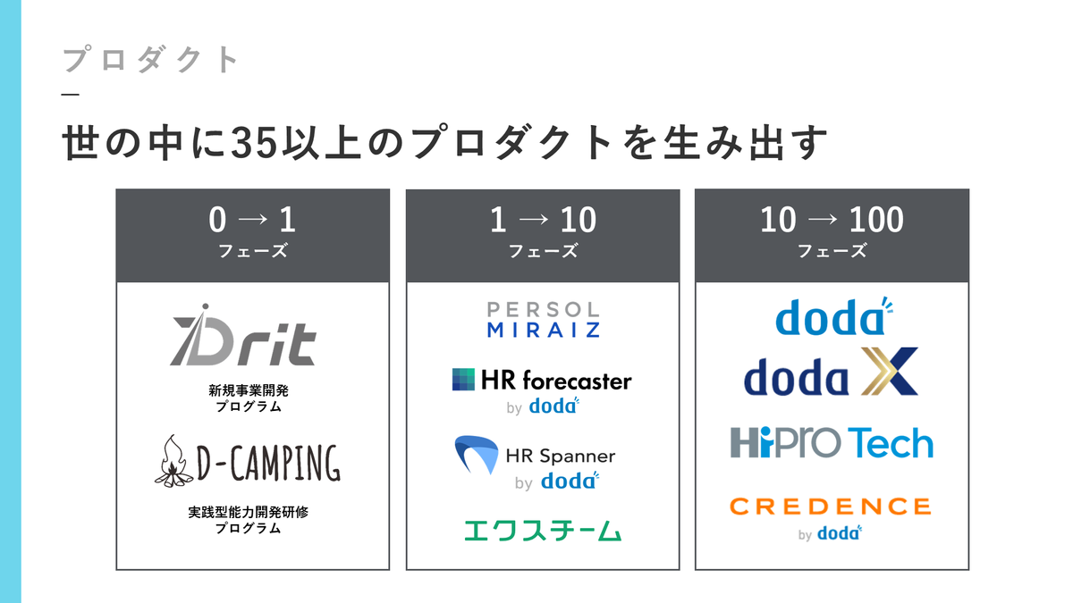 例えばdoda自体は、転職サービスとしてもう35年を迎えました。日本で最大級のサービスで、先ほど冒頭に1,000万人の切り拓くって書いてあったんですけど、実際もう会員数が1,000万人ぐらいいる、日本最大級のサービスになっています。時代に淘汰されることなく成長し続けているので、引き続きdodaに限らず、右側で言うとHiProといういわゆるフリーランスのマッチングサービスであったりとか、CREDENCEというアパレル向けのサービスだったりもやっています。