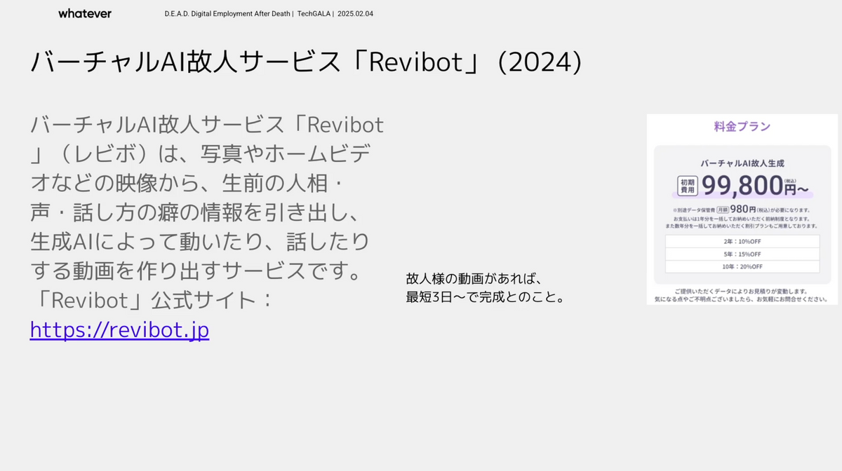 富永:そうですね。(スライドのバーチャル故人サービス「Revibot」を示して)それがいまや、このサービスでは「故人さまの動画があれば、最短3日から完成」と書いてあるんです。僕は別に回し者じゃなくて、たまたま見つけたんですけど。