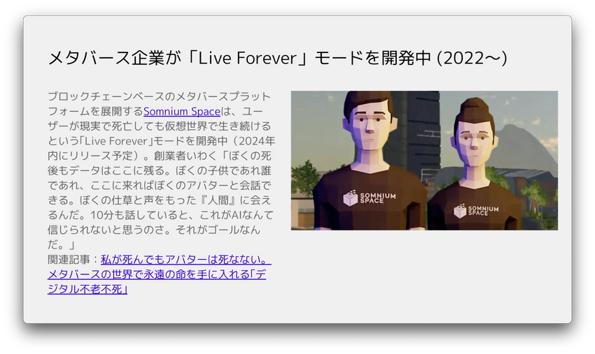 富永勇亮氏(以下、富永):こちらの事例はまさにブロックチェーンのメタバースで、「Live Forever」モードというのを選択できます。これは創業者の人が、家族の死を経験して、自分自身を生き残らせておくことで、家族と対話ができる場所を作ろうとしているんですね。