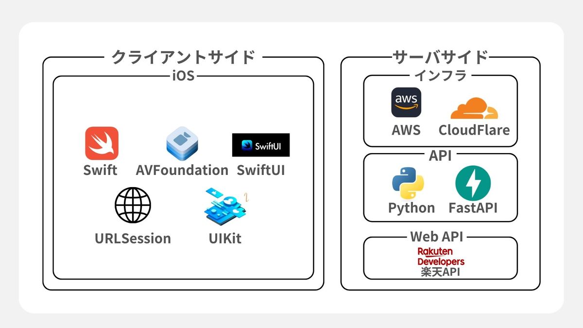 ごみちゃん:次に技術スタックです。技術スタックは以下のとおりになっていまして、クライアントサイドはiOSで、Swiftで書いています。サーバーサイドはGoで作っています。
