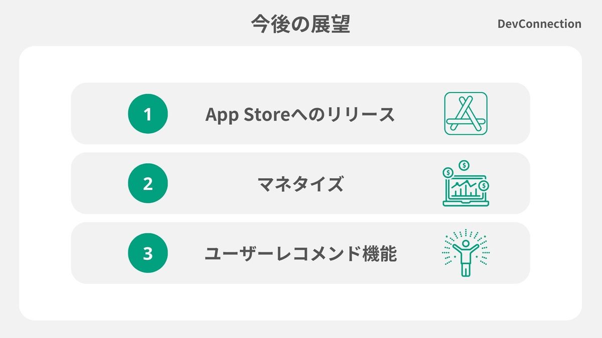 開発期間がまだ1ヶ月なので申請中なんですけど、今後リリースされるので、今しばらくお待ちください。今後はApp Storeへのリリース、そしてマネタイズ、ユーザーレコメンド機能の実装をしていきたいと考えています。