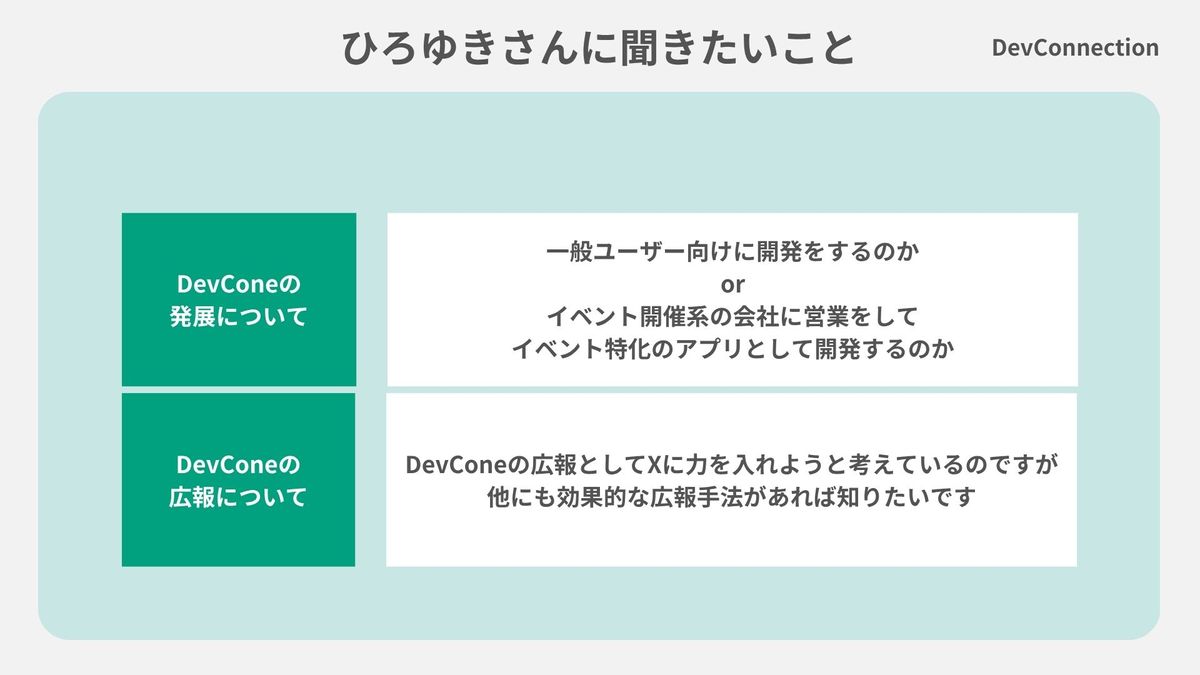 今回ひろゆきさんにお聞きしたいことは、DevConeの発展についてと、あとはDevConeの広報について、この2点についてお聞きしたいと思っています。本日はよろしくお願いいたします。