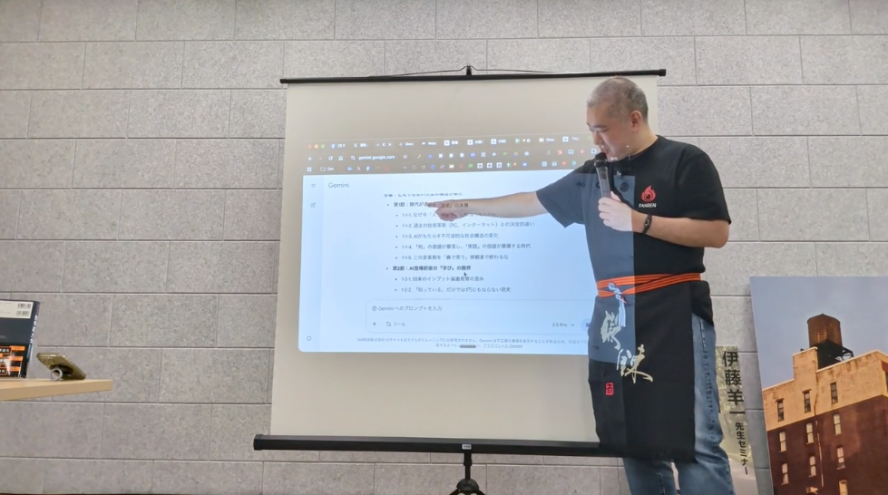 AIの魅力。これ、AI独学術っていうところを考えると、誰でも簡単にインプットができる時代になりました。頭の中に思い浮かんだことを、とにかくダラダラでもグダグダでもいいので、こうやってカンペを読みながらでもいいので、重要だと思っていることを一言一言、ずっと紡ぎ出していくことが非常に重要です。